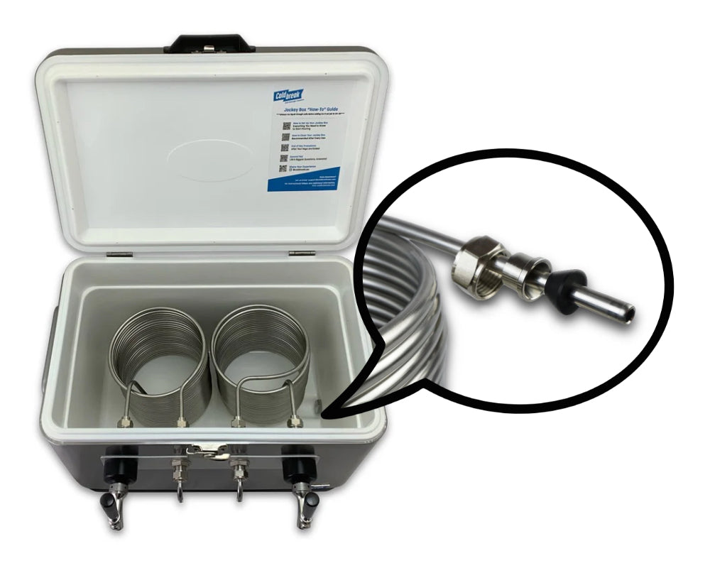 Note re. universal threads: All of our jockey boxes use the industry standard thread, 7/8”-14 (5/8” BSP). It’s the same thread that is used on standard keg couplers and tailpieces and hex nuts. If you have existing jockey box beverage jumper tubing, they will fit our jockey boxes.